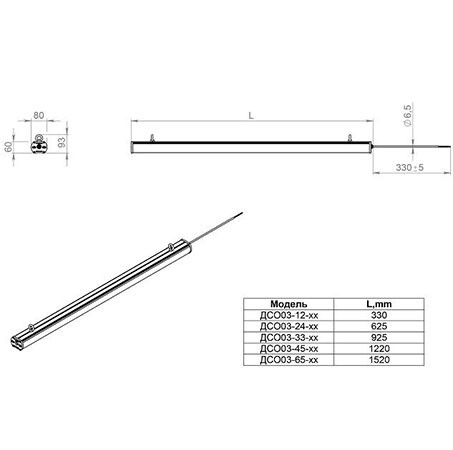 Габаритные размеры светильника, мм 80х300х60
