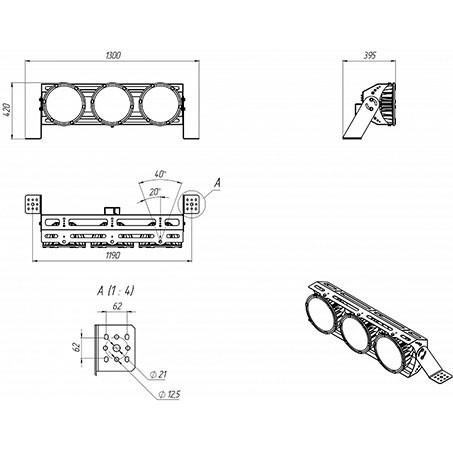 Габаритные размеры светильника, мм 1300х420х395