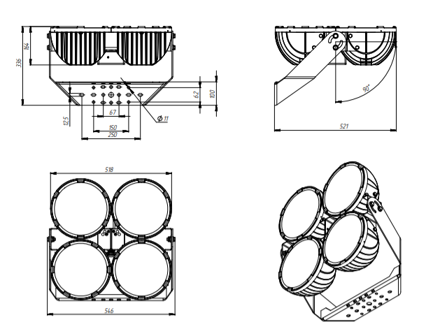 | Габаритные размеры светильника, мм | 518х546x336 |