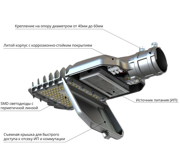 - литой корпус, обеспечивающий малые вес и габариты, регулировку угла наклона светильника, а также удобное обслуживание (доступ в корпус без дополнительного инструмента);
